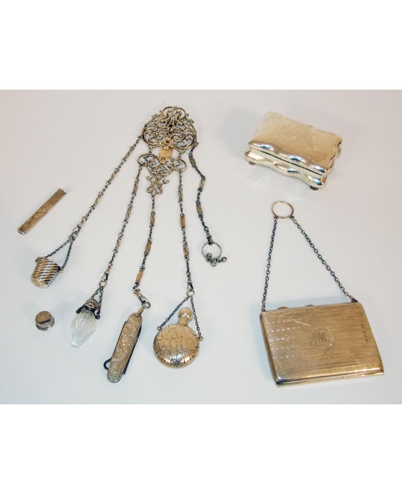 Lotto di vari oggetti in argento, tra cui una scatolina con bolli 800, un borsellino ed un set composto da un ditale, due bottigliette, un anello ed un coltellino con bolli Birmingham degli inizi del sec. XX. Peso tot. gr. 340 (lievi difetti)