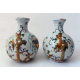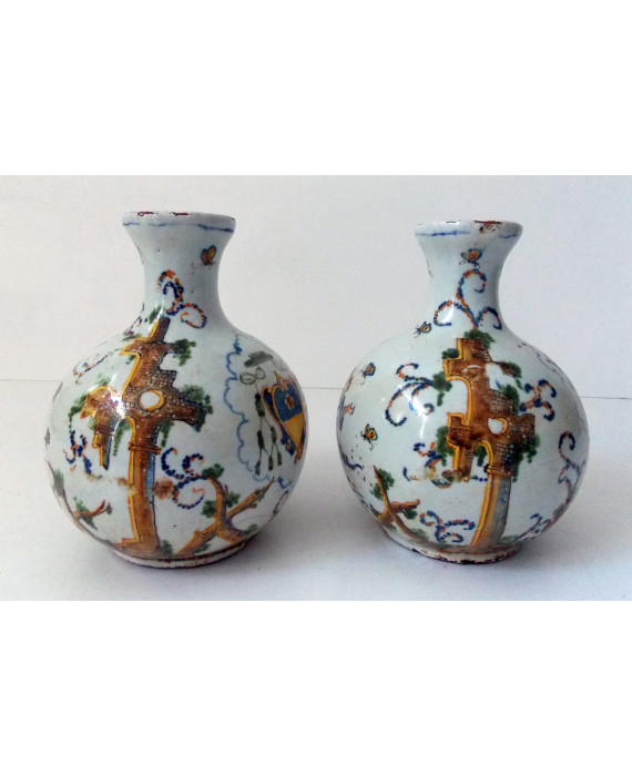 Antica coppia di vasi globulari in maiolica dipinta con architetture, personaggi, farfalle e stemmi araldici. Alt. cm24 (filature e lievi scheggiature)