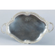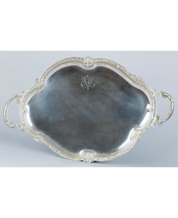 Elegante vassoio in argento 800, bordo e manici lavorati a volute vegetali e fiori, monogramma centrale inciso. cm66x42. Peso gr. 2540