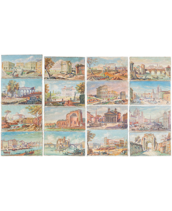 Vedute romane Questa serie di sedici vedute romane deriva da dipinti eseguiti da Giovanni Battista Busiri, uno tra i maggiori vedutisti romani del Settecento, la cui produzione pittorica è esclusivamente formata da piccole tempere che erano destinate a ricoprire la richiesta di souvenir per i numerosi viaggiatori del Grand Tour. Si osserva, in particolare, che la Veduta di Villa Borghese e la Veduta del Colosseo con l’arco di Costantino derivano da due dipinti di Busiri già in possesso dell’architetto Andrea Busiri Vici a Roma.