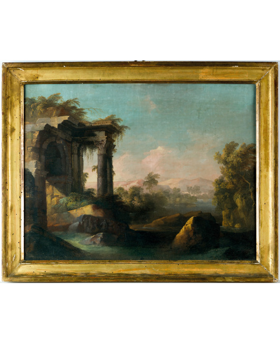 Paesaggio con rovine e viandanti, con cornice. L’opera, una tempera di piccolo formato, evoca la pittura di Mauro Braccioli, scenografo noto soprattutto agli studiosi specialisti di questo genere. La produzione artistica di Braccioli, dove i disegni superano di numero i dipinti, è caratterizzata da una forte suggestione da Giovanni Battista Piranesi (1720-1778), che egli però rielabora con piena originalità attraverso l’indubbia prima formazione bibbienesca. Esempi di sue opere sono alla Galleria Nazionale di Parma e alla Galleria Antiquaria Lampronti di Roma.