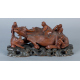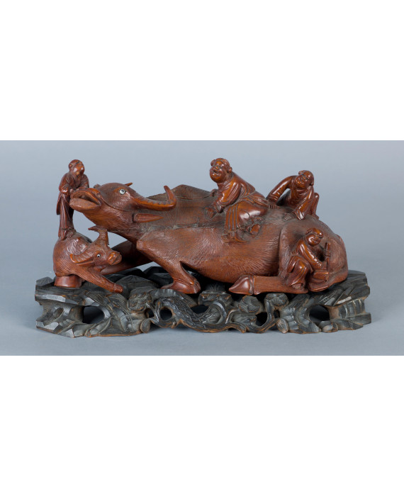 Scultura in legno raffigurante bufalo d'acqua con personaggi, occhi in vetro e base ebanizzata in legno intagliato. Cina, inizi sec. XX. Lungh. cm38 (lievi difetti)
