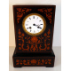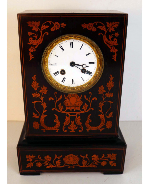 Orologio da tavolo impiallacciato in legno di mogano e con fronte intarsiato a volute vegetali e fiori, quadrante in smalto. Francia, periodo Carlo X. cm33x22x12 (difetti al quadrante e da revisionare)