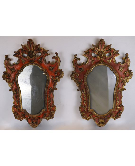 Coppia di specchierine laccate in rosso, dorate e lavorate con volute vegetali, fiori e volto maschile centrale. cm55x47 (difetti)
