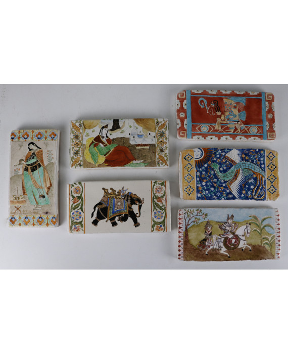 Serie di sei placche in maiolica dipinta con personaggi ed animali. cm12x24