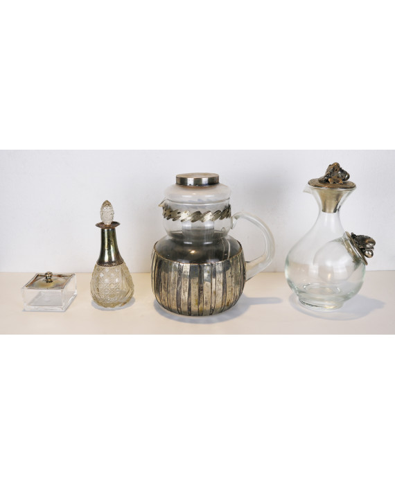 Lotto di quattro oggetti in vetro con applicazioni in argento: un posacenere, due bottiglie con tappo ed una caraffa
