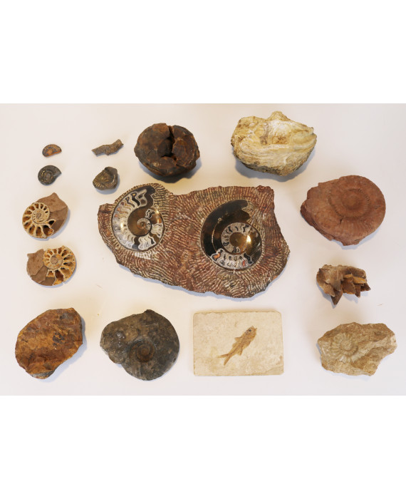 Lotto di quindici fossili e minerali, tra cui alcune ammoniti ed un trilobite