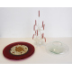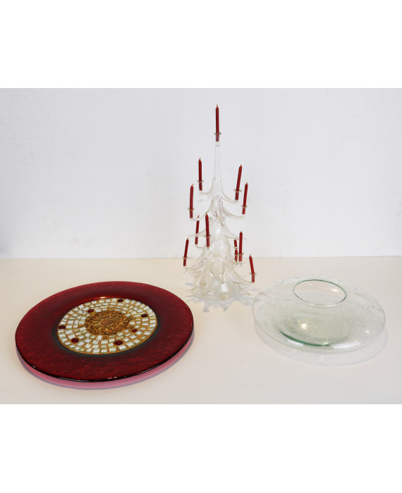 Lotto di tre oggetti in vetro: un candeliere da tavolo a forma di pino, un vaso inciso con edera ed un sottopiatto a fondo rosso con centrale a mosaico. Alt. cm35/8; diam. cm34