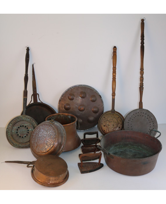 Lotto di numerosi rami: quattro ferri da stiro, due caldaie, uno stampo per dolci, un passino, due pentole e tre scaldini (difetti)