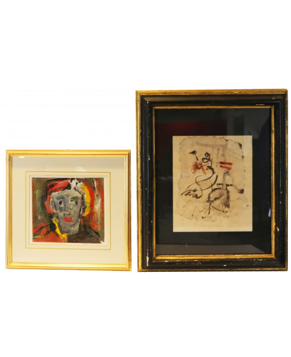 Lotto di due dipinti: Claudio Simard. Volto, 1987. Olio su carta, firma e data in basso a destra, con cornice. Artista del sec. XX. Composizione. Acquarello su carta, con cornice.