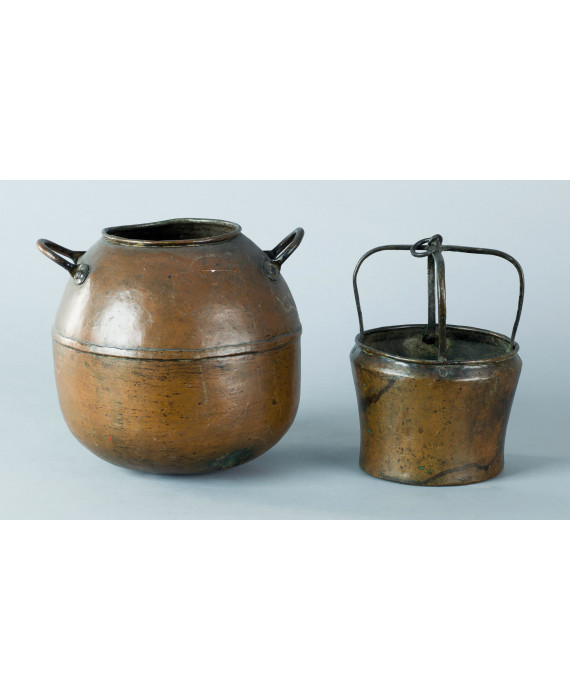 Lotto di due antichi contenitori in rame battuto. Alt. cm25 (ammaccature)