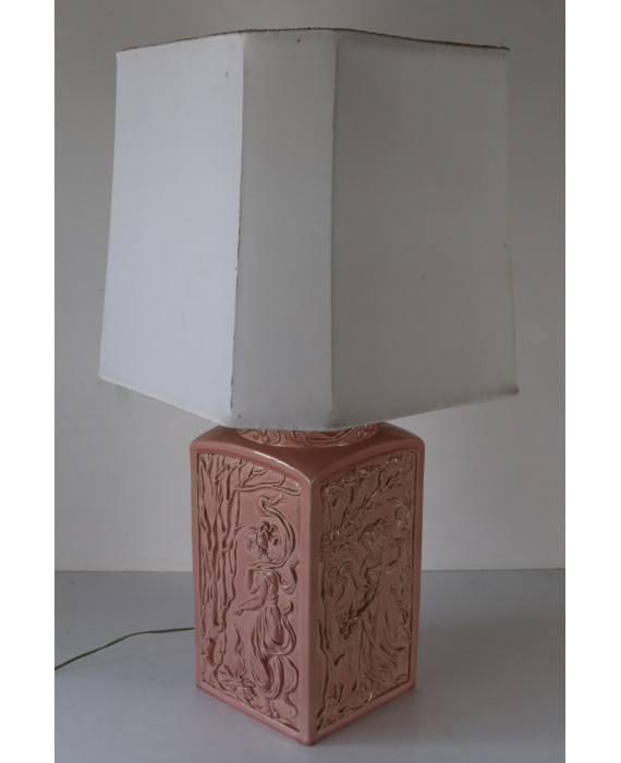 Lampada da tavolo in ceramica a fondo rosa lavorata a bassorilievo con allegoria delle quattro stagioni, completa di paralume. Alt. cm40
