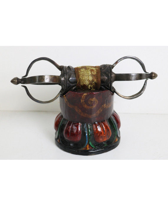 Vajra in metallo (scettro rituale tibetano) con base in legno dipinto. Tibet, sec. XX. Lungh. cm27