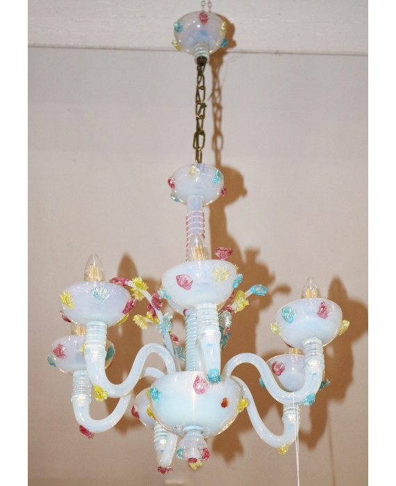 Lampadario a sei luci in vetro trasparente di Murano con applicazioni policrome (lievi difetti e mancante di un elemento)