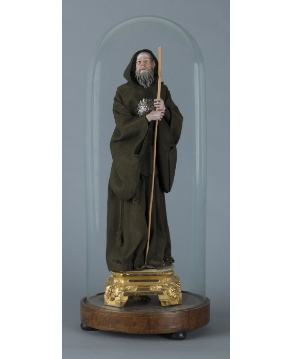 Giuseppe Manzo (1849-1942). San Francesco da Paola. Opera in terracotta con abiti in tessuto, in campana di vetro con base in legno. Alt. cm56
