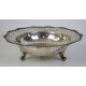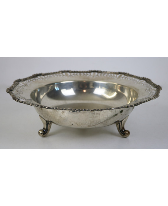 Centrotavola in argento 800, corpo liscio, bordo traforato e lavorato con serti vegetali e fiori, tre peducci a voluta. Peso gr. 720 (lievi ammaccature)