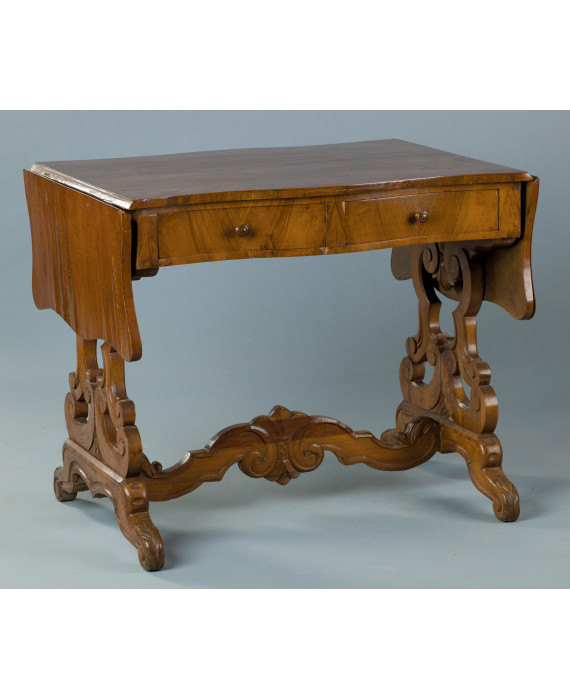 Tavolo a bandelle impiallacciato in legno di noce, due cassetti, due sostegni intagliati a volute raccordati da traversa. Italia, sec. XIX. cm77x95x66 (mancanze alla lastronatura)