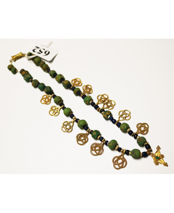 Collana con perle in pasta vitrea, con chiusura ed applicazioni in oro 18Kt e 9Kt. Peso tot. gr.60,9. Allegata dichiarazione del gemmologo Gianfranco Rotisciani (mancanza)