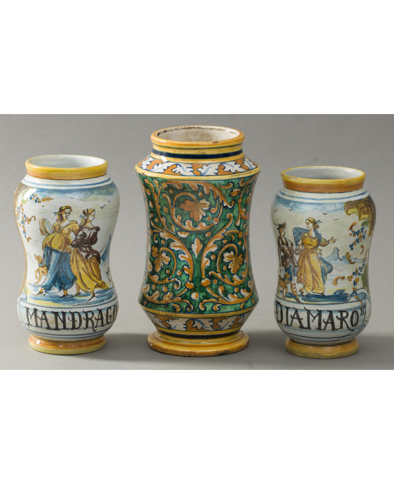 Lotto di tre albarelli in maiolica: uno dipinto con serti vegetali ed una coppia dipinta con personaggi, architetture e iscrizioni. cm26/24(2)