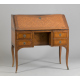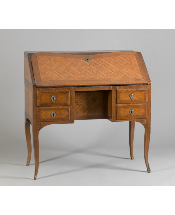 Ribaltina lastronata ed intarsiata in bois de rose, legno di noce e mogano, calatoia con all'interno quattro cassettini, vani a giorno ed un segreto, quattro cassetti laterali, gambe mosse. Francia, sec. XVIII. cm95x94x46 (difetti alla calatoia)