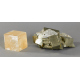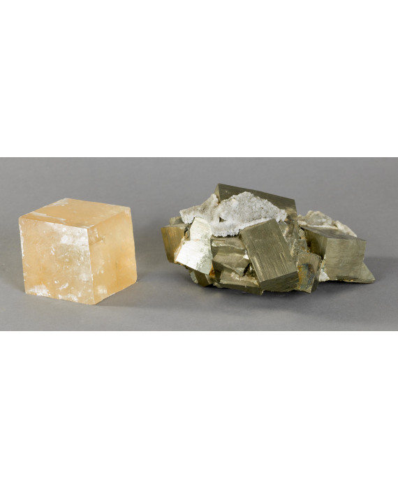Lotto di un frammento di pirite, proveniente dalla Spagna e un frammento cubico di calcite. cm9x20x16/7x7x7
