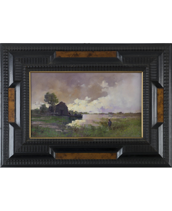 Paesaggio lacustre con pescatori, con cornice