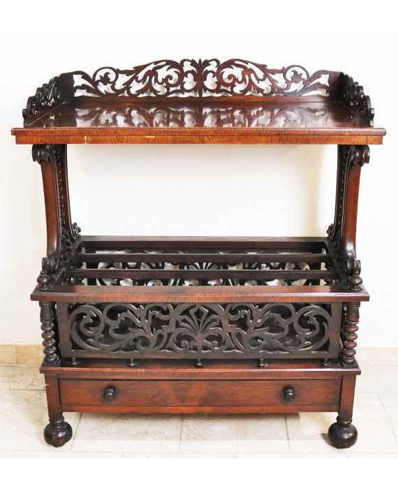 Mobiletto a giorno impiallacciato in legno di palissandro con ringhierine traforate a volute, colonnine tornite, vani portariviste e cassetto inferiore. Inghilterra, fine sec. XIX. cm97x87x45
