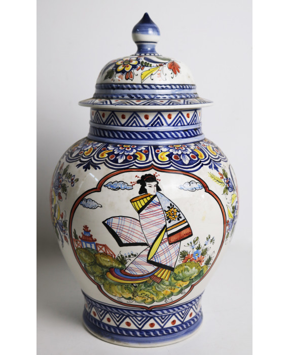 Vaso con coperchio in ceramica dipinta con fiori e personaggio orientale. Manifattura di Bassano, sec. XX. Alt. cm48