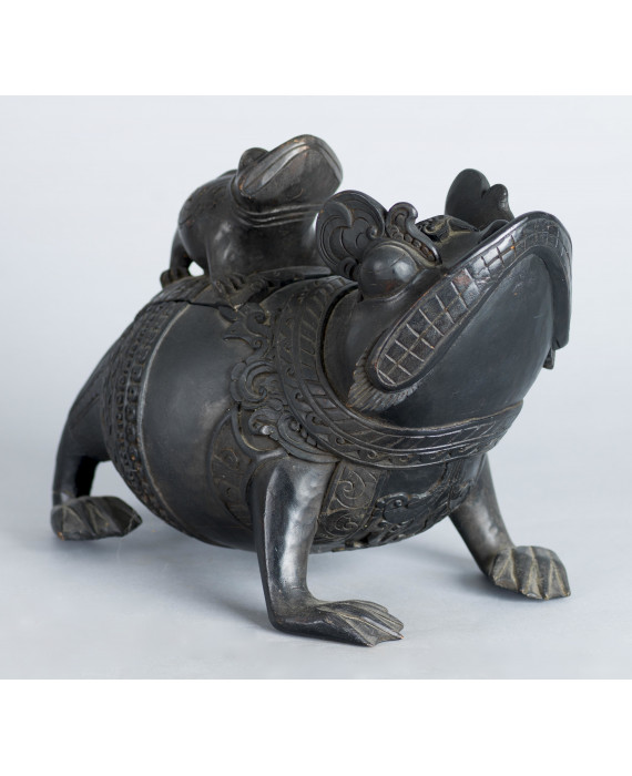 Scatola in legno ebanizzato a forma di rana con ranocchio. Indonesia, sec. XX. Alt. cm26