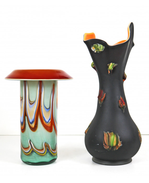 Lotto di due vasi in vetro: uno policromo di Murano ed uno nero con applicazioni policrome di marca Golden Talast. Alt. cm30/46