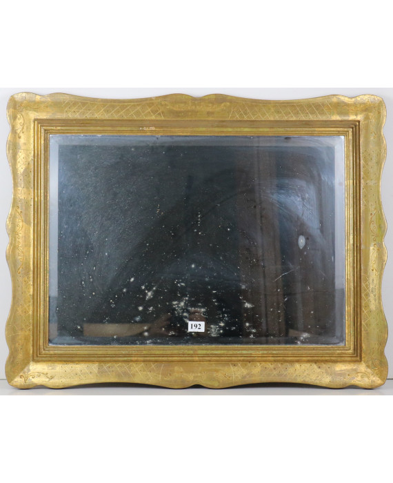 Specchiera in legno dorato ed inciso a volute e motivi geometrici. cm68x90