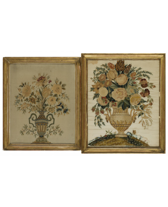 Lotto di due pannelli in tessuto ricamato in policromia con vasi di fiori, con cornici. Italia, sec. XIX. cm55x45/50x40 (lievi macchie e difetti alle cornici)