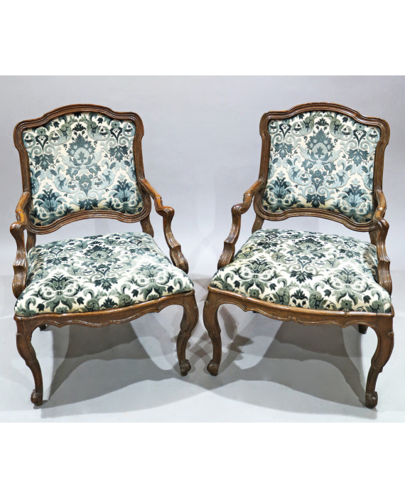 Coppia di poltrone in legno di noce, braccioli e gambe mosse, seduta e spalliera rivestite in stoffa. Italia, sec. XVIII