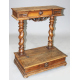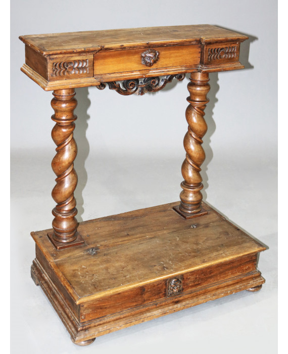 Inginocchiatoio in legno di noce, un cassetto, due colonnine tortili, piano inferiore apribile. cm84x68x43