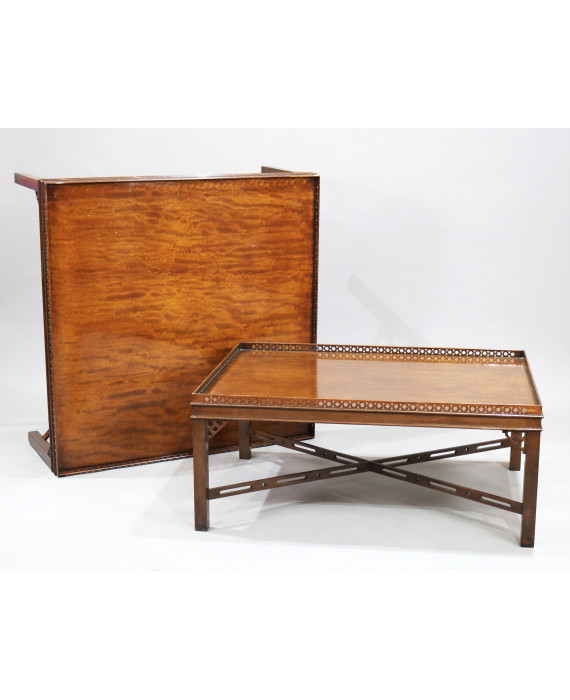 Lotto di due tavolinetti in legno di mogano con ringhierine e traverse traforate. cm46x117x76/46x117x107 (rottura ad uno)
