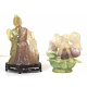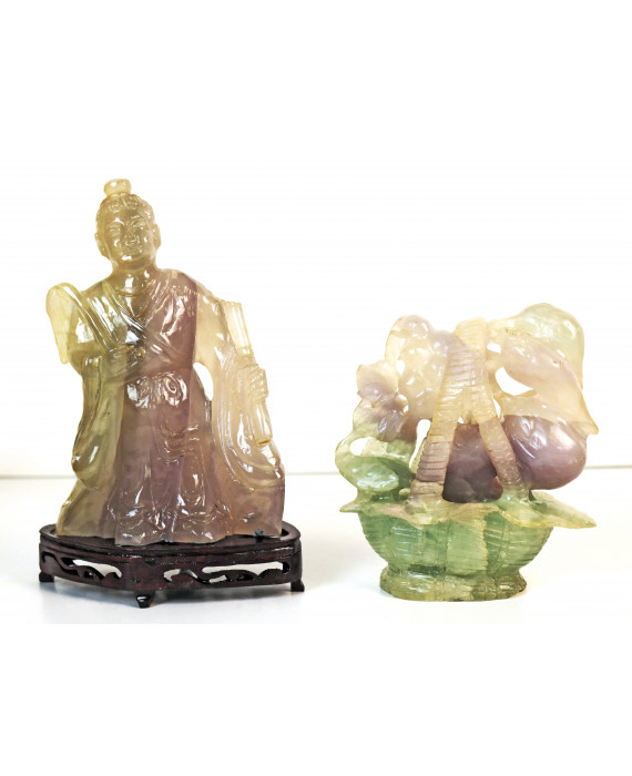 Lotto di due sculture in fluorite raffiguranti divinità e cesto con frutta. Cina, sec. XX. Alt. cm18/15