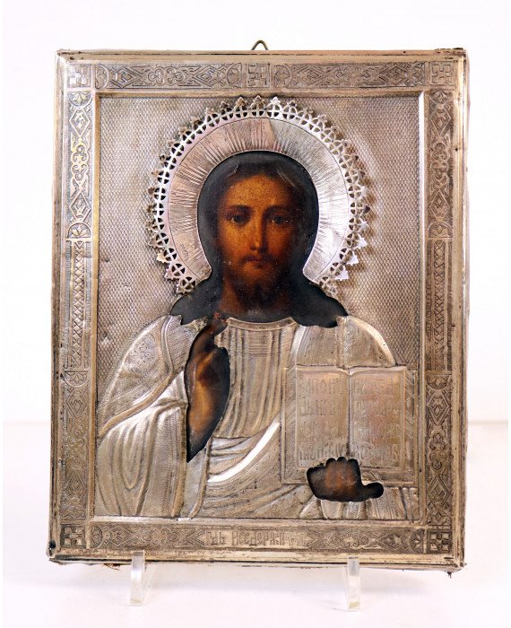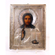 Icona dipinta su tavola con Cristo Pantocratore, riza in argento sbalzato ed inciso con bolli Russia 1889. cm22x18