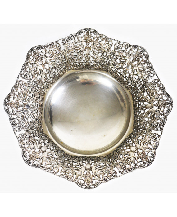 Elegante centrotavola in argento 800 con tesa traforata e riccamente lavorata con fiori, motivi vegetali ed amorini, tre peducci a voluta. Diam. cm29. Peso gr. 660