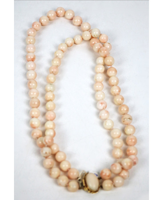 Collana in corallo rosa naturale, con chiusura in oro 18Kt. Peso tot. gr. 120,6. Allegata dichiarazione di autenticità del gemmologo Gianfranco Rotisciani