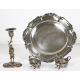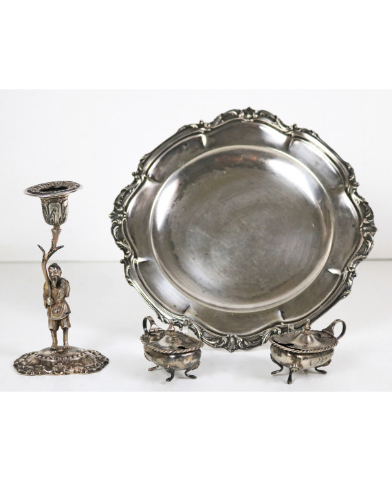 Lotto di un piatto in argento 800 con bolli periodo del fascismo e due salierine ed un candeliere, in argento 800. Peso tot. gr. 480