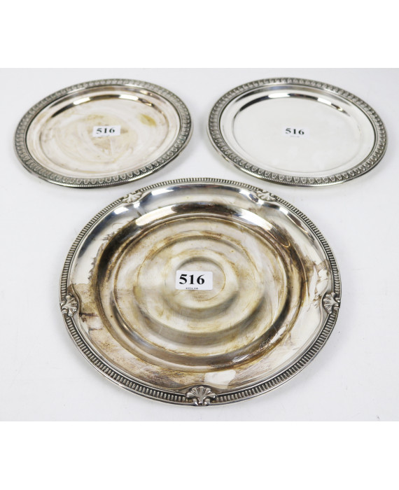 Lotto di tre vassoi tondi in argento 800 con bordi lavorati a palmette e perlinature. Peso tot. 740