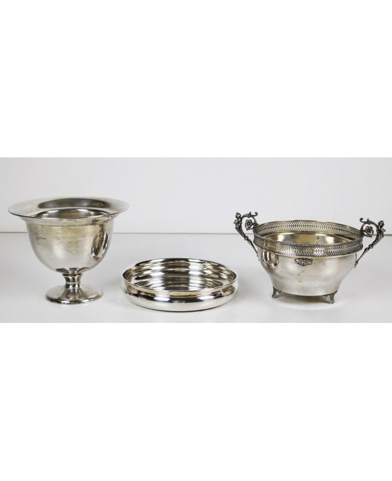 Lotto di un piattino, un centrotavola biansato a bordo traforato ed una coppa a corpo liscio, in argento 800. Diam. cm18; alt. cm14(2). Peso tot. gr. 860 (piccola ammaccatura al piattino)
