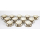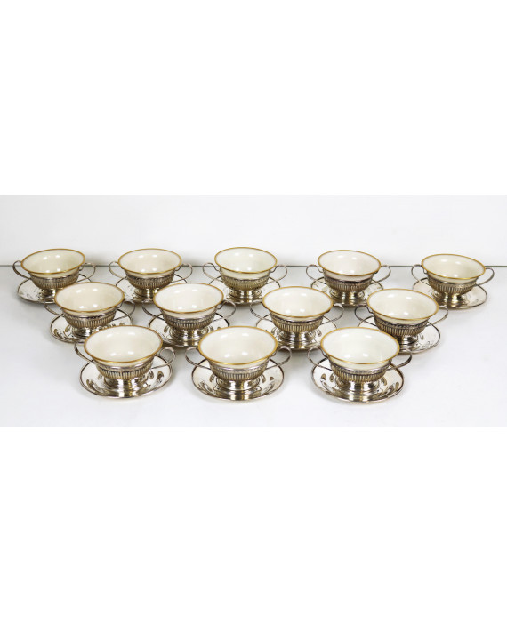 Servizio da dodici tazze da consommè in porcellana a fondo avorio, con cestini e piattini in argento 925. Peso del solo argento gr. 1340 (difetto ad una tazza)