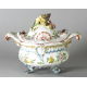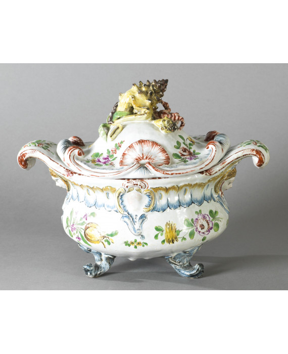Zuppiera in maiolica dipinta con rami fioriti, anse a voluta con attacco a mascherone, pomolo a conchiglia, corpo bombato poggiante su tre peducci a ricciolo. Probabile manifattura Nove di Bassano del sec. XVIII. cm27x33x19 (mancanza al pomolo e lievi abrasioni)