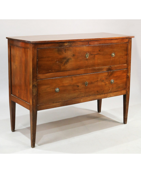 Comò in legno di noce, due cassetti, quattro gambe piramidali. Italia, sec. XIX. cm102x129x55