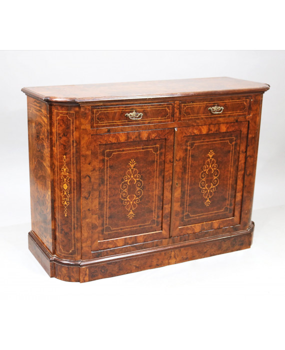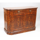 Credenza impiallacciata in radica di tuja con filettature ed intarsi in legno di acero, due cassetti, due sportelli inferiori. cm90x130x50