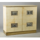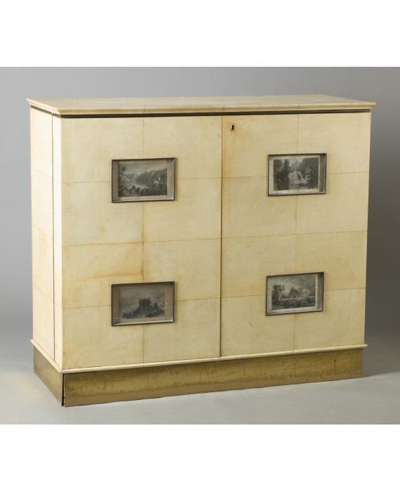 Mobile bar a due ante interamente rivestito in pergamena con fascia in ottone dorato e quattro formelle con stampe policrome, all'interno rivestimento a specchio, otto cassettini, vani a giorno e vassoi estraibili. Design, anni '50. cm107x123x49 (usure del tempo, macchie e rottura ad uno specchio interno)