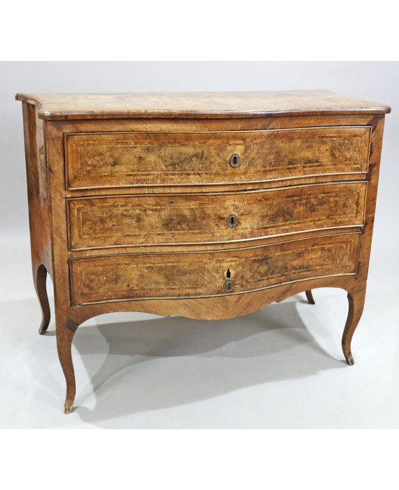 Comò a balestra lastronato in legno di noce e filettato in bois de rose, tre cassetti, quattro gambe mosse. Italia, sec. XVIII. cm101x132x62 (da restaurare)