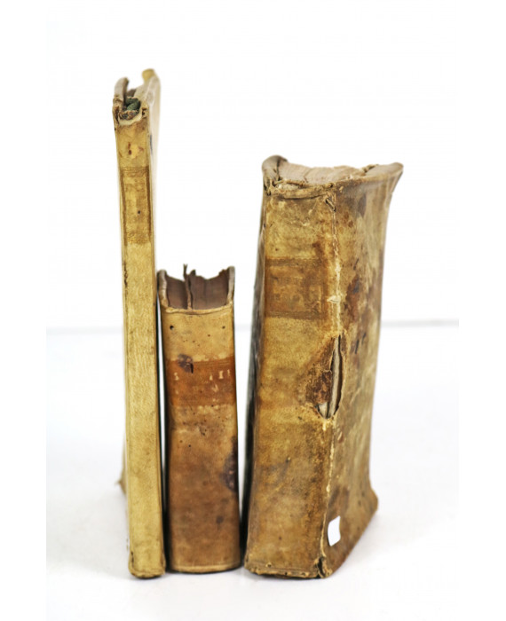 Lotto di tre volumetti con coperte in pergamena: Della maniera di prevenire le liti o si dell'istituzione de' pacieri. Volume senza indicazione dell'autore nè del luogo e della data di stampa; Padre Claudio Buffier. Geografia universale. Venezia, Appresso Giuseppe Rossi q. Bortolo. 1791. Volumetto con difetti alla coperta; Statii Papinii Neapolitani. Sylvarum libri V. Therbaidos lib. XII. Achilleidos Lib. II. Lugduni, 1559. Volumetto con coperta in pergamena (grave strappo al frontespizio).
