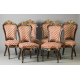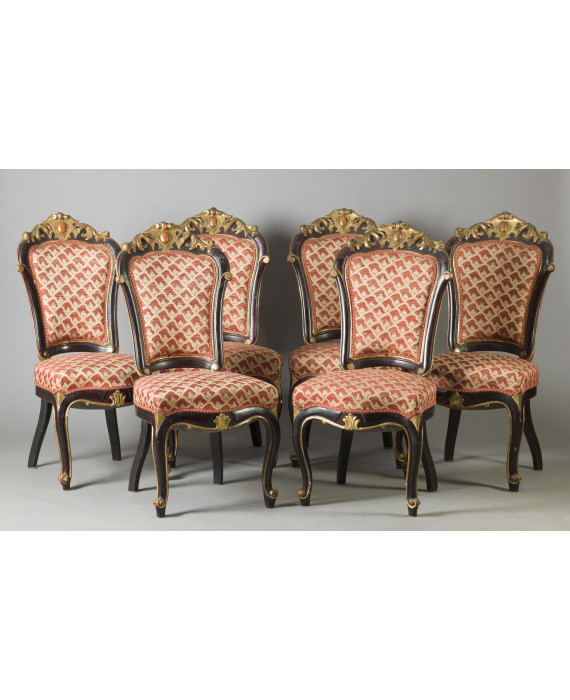 Gruppo di sei sedie in legno laccato, dorato ed intagliato a volute vegetali, gambe anteriori mosse, seduta e spalliera rivestite in stoffa. Italia, periodo Luigi Filippo (lievi difetti)